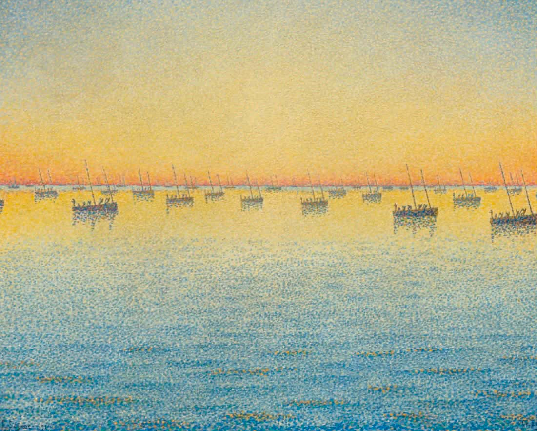 La Paul Signac, soarele are muzicalitate. În „Apus de soare. La pescuit de sardine. Adagio. Opus 221”, ambarcațiunile abstractizate devin note pe un portativ, iar apusul o experiență optic-muzicală. Prin tehnica pointilistă, cu puncte pure de culoare, lumina vibrează, aproape se aude.