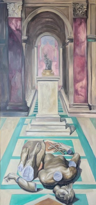 : COADY (AUS), Cat-a-Tonic Construct3. Bianca Ferăstrău, Triumph of Azure, 2025, ulei pe pânză, 202 x 95 cmion 2, 2025, inox, acrilic, policarbonat și mixed media, 96 x 65 x 13 cm