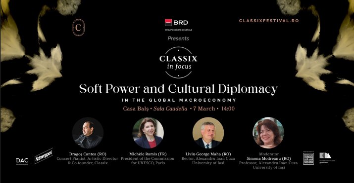 Invitații vor fi Dragoș Cantea, pianist, director artistic și cofondator al Classix, Amb. Michèle Ramis, Președinte al Comisiei pentru UNESCO, alături de Prof. Liviu-George Maha, Rector al Universității „Alexandru Ioan Cuza” din Iași. Moderatorul va fi Simona Modreanu, profesor universitar la Universitatea „Alexandru Ioan Cuza” din Iași. Dialogul va aborda modul în care influența culturală poate deveni un instrument strategic în context global.