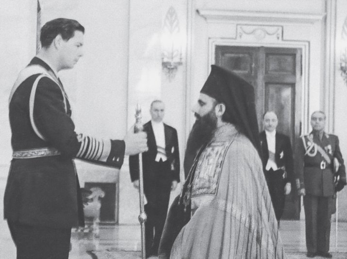 Arhiva Istorică Agerpres - Ultima învestitură regală a ierarhilor Bisericii Ortodoxe Române, în Sala Tronului din Palatul Regal, 22 decembrie 1947. Justinian Marina, mitropolitul Moldovei, primește cârja arhiepiscopală din mâinile regelui Mihai. În plan secund, Curtea, de la stânga la dreapta: Dimitrie Negel, mareșalul Curții, Octav Ulea, maestrul Curții, și prim-adjutantul Emilian Ionescu.